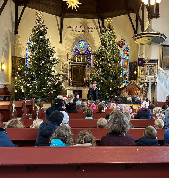 Wir hören die Weihnachtsgeschichte in der Friedenskirche Groß Oesingen mit allen Kindern unserer Einrichtung.
